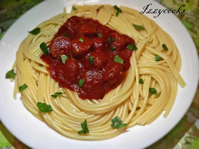 Спагети с пушена наденица