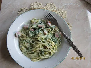 Спагети със спанак, шунка и сметанов сос