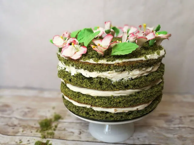Може и цялата да се измаже и декорира с трохи от изрязаните по-рано блатове. В случая е поръсена само от горе, а украсата е от фонданови цветове и листа.