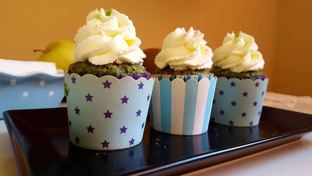 Едни зелени къпкейкчета с плодове и вкусен крем. След като има спаначени торти има и кексчета