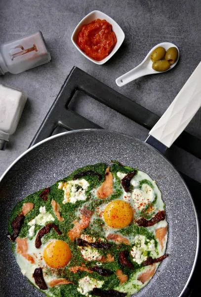 Спаначник на тиган с рохки яйца и пушена сьомга