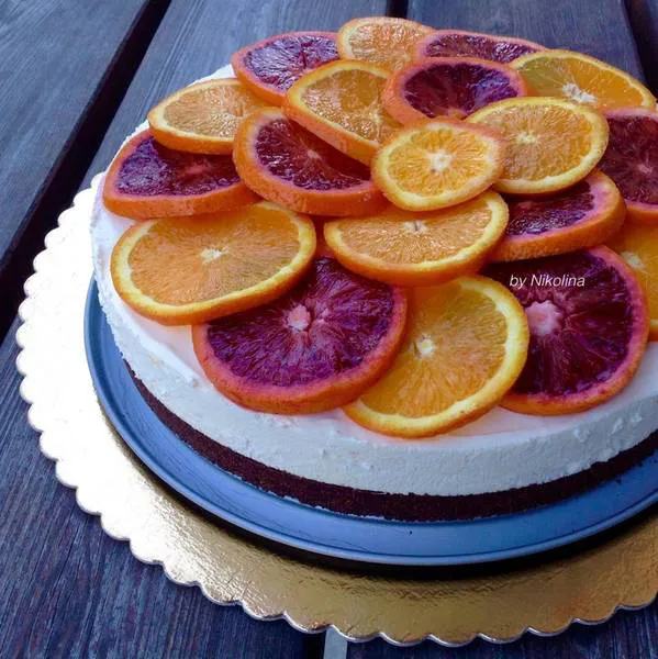- През това време желатинът се накисва в студена вида за около 10 минути. Сиренето се разбърква с пудрата захар, настърганата кора и сока на портокала. Сметаната се разбива, като една малка част се заделя и се загрява на котлона само до затопляне, след което в нея се разтваря отцеденият / изстискан / от водата желатин. Прибавя се към сместа със сиренето и се разбърква добре. Накрая се добавя и разбитата сметана. Обърква се и полученият крем се изсипва във формата върху блата от бисквити.