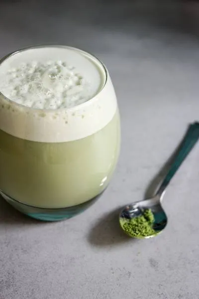 Комбинацията с бадемово мляко омекотява силния вкус на матчата много хармонично, затова аз го предпочитам така