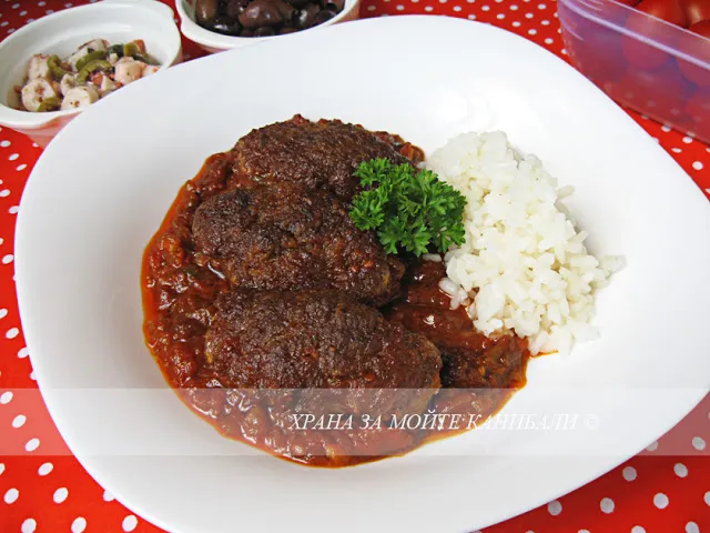 Кюфтета в доматен сос е любима рецепта. Можа да разнообразим и по този начин. Има разлики във формата и в накисването на хляба във вино