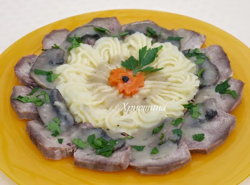 Филийки език се подреждат в чиния, гарнират се с пюре от картофи и се заливат със соса.