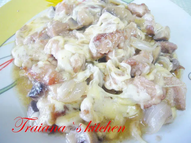Пилешко и свинско месо, и кърначе върху канапе от ориз със зеленчуци