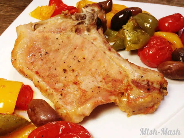 Опитайте тази невероятно сочна рецепта за свински котлети в комбинация с печени зеленчуци и маслини Каламата. Наслада за всички сетива!