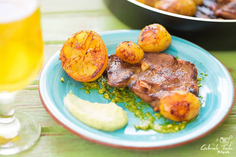 Свински пържоли върху канапе от босилеково песто и разядка от хумус