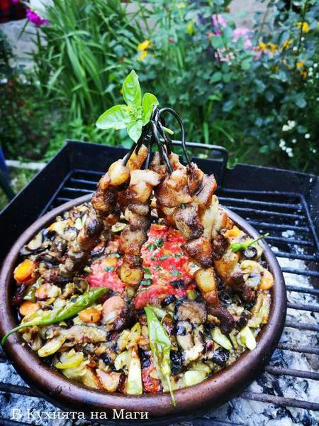 Свински сач с нарязани зеленчуци