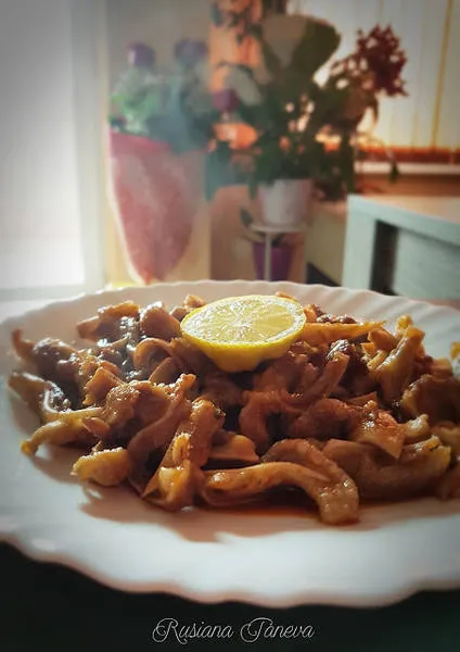 Поднесете мезето топло, гарнирано с резенче лимон