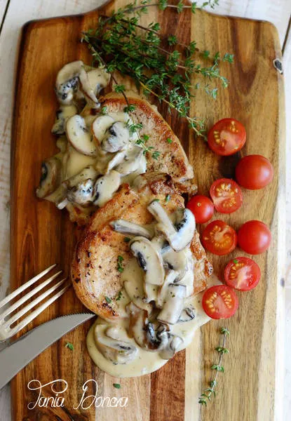 Свински вратни пържоли с чесън, мащерка и гъби