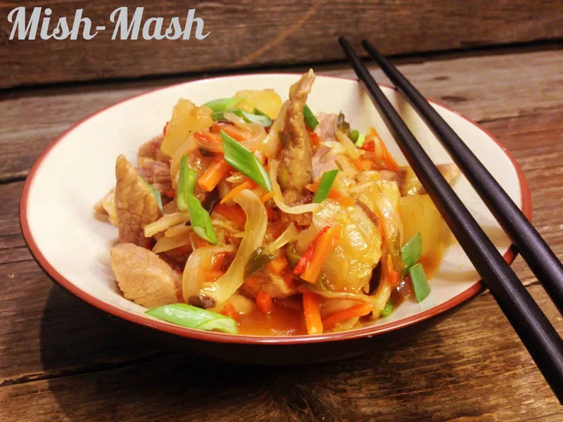 Много вкусна и бърза за приготвяне рецепта. В главните роли - свинско месо, ананас от консерва и готов зеленчуков микс по китайски.