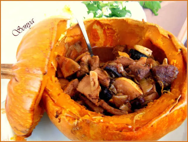 Свинско с дюли, печено в тиква