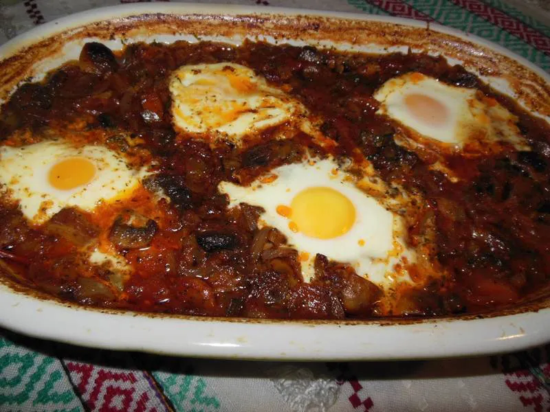 Свинско месо, яйца и много вкусен сос.