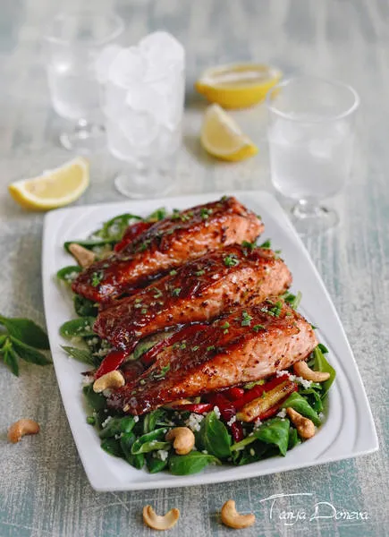 Сьомга с карамелизирана коричка върху салата с кус-кус и печени зеленчуци