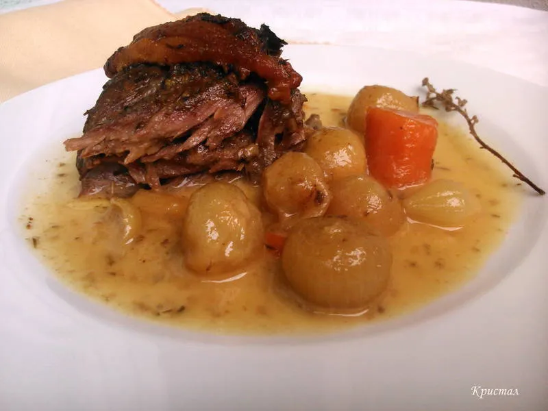 Мариновано с вино и подправки. Печено с малки лукчета и моркови. За аромата и вкуса – няма как да го опиша, трябва да се опита :)