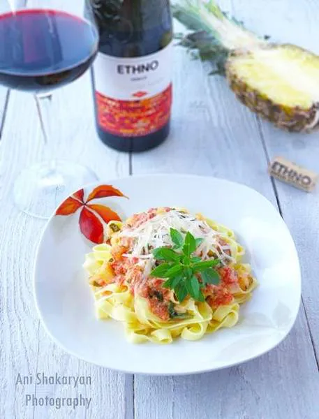 Талиателе в доматен сос с козе сирене, ананас и рукола