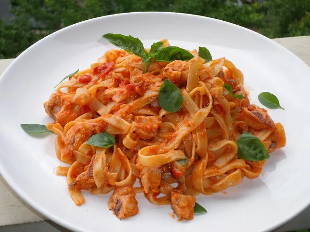 Смесете талиателите с доматения сос и рибните парчета.Разбъркайте внимателно.Сервирайте и поръсете с листа босилек.