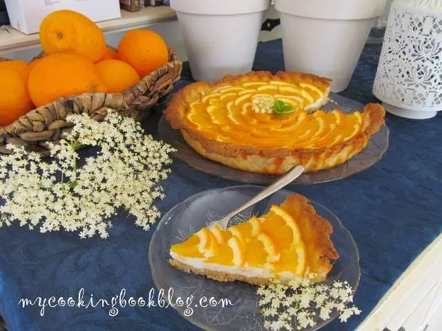 Една много свежа рецепта за портокалов тарт, приготвен с крем от маскарпоне с глазирани портокалови корички и Куантро (портокалов ликьор)