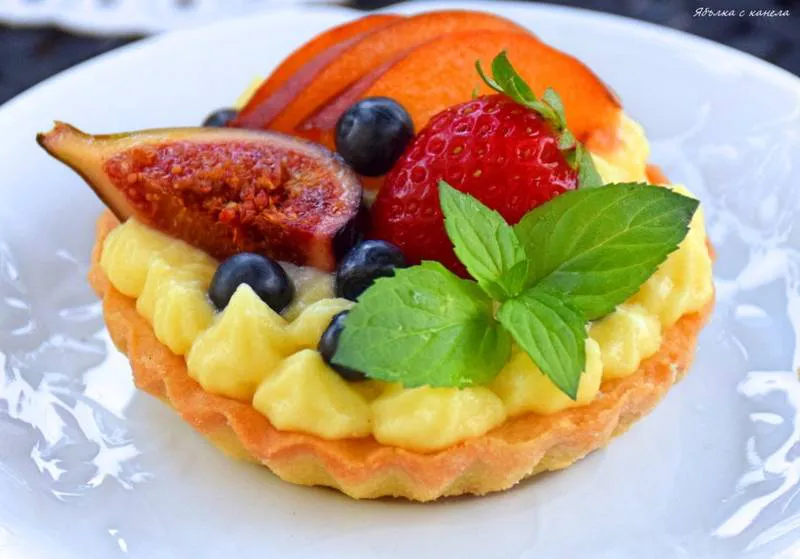 Хрупкави и топящи се в устата маслени бисквитки с пълнеж от чудесен ванилов крем. Завършекът от пресни сезонни плодове придава свежест и допълнителен аромат на десерта.