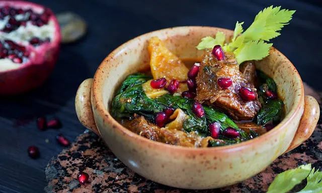 Телешка яхния с нар, спанак и индийски подправки