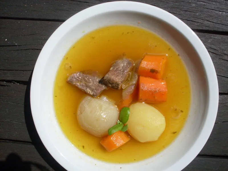 Рецептата е предадена от моята майка. Приготвянето на кубчета телешко месо с цели картофчета, морковчета и лук е празник за окото. Красива супа или основно ястие!