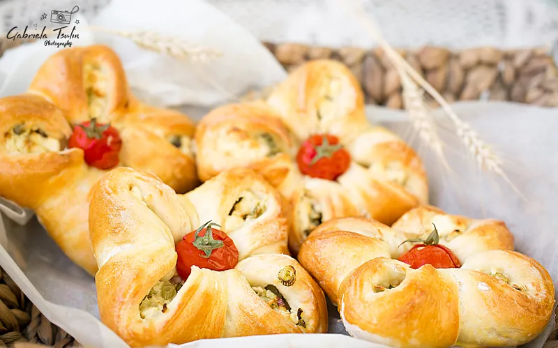 Тестени цветя с козе сирене, пресен лук и чери домати