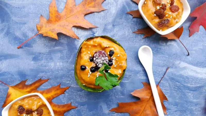 Печена тиква и компания поднесени като крем в половинки от авокадо