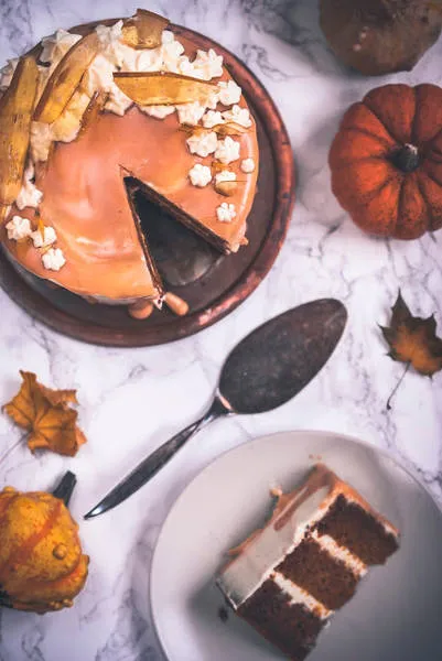Тортата е сочна, вкусна, с прекрасните аромати на тиква, канела и джинджифил, и става просто невероятна в комбинацията с крема сирене и солен карамел.
