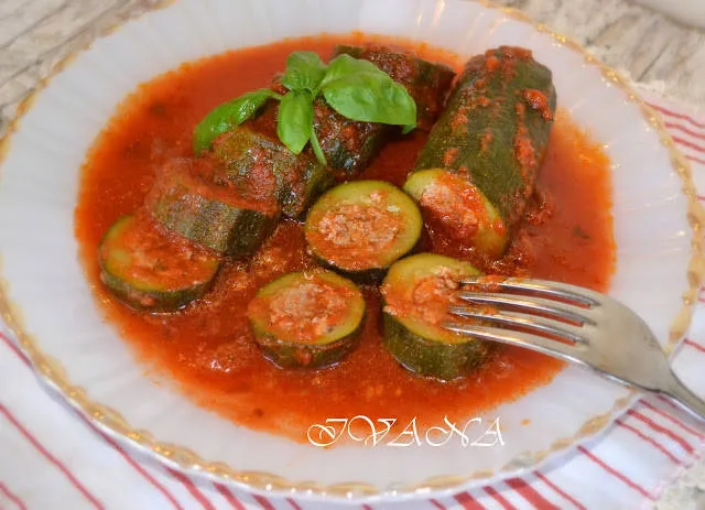 Тиквички с кайма в доматен сос