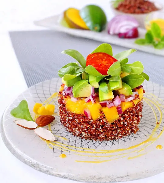 Тимбал от червена киноа с манго, авокадо и медено-горчичен сос