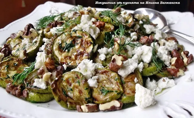 Топла салата от тиквички със сирене, орехи и копър