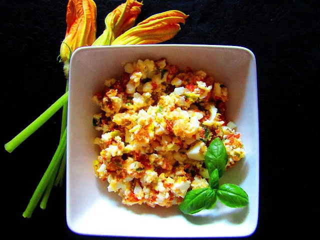 В купа смесвам цветовете от тиквички, сварените яйца, сиренето и пармезана