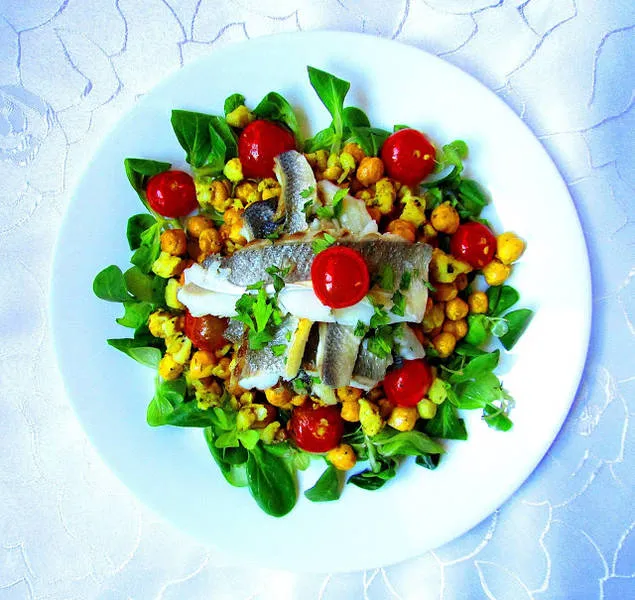Топла салата с лаврак и нахут