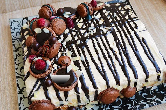 Използвах три различни блата - ванилов, орехов и какаов; три различни крема - млечен с шоколад, с крем сирене, карамелен.