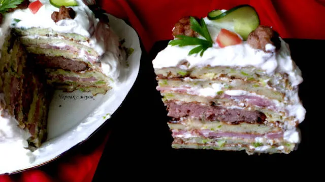 Торта от тиквички,цедено подлучено мляко,шунка и кюфтенца
