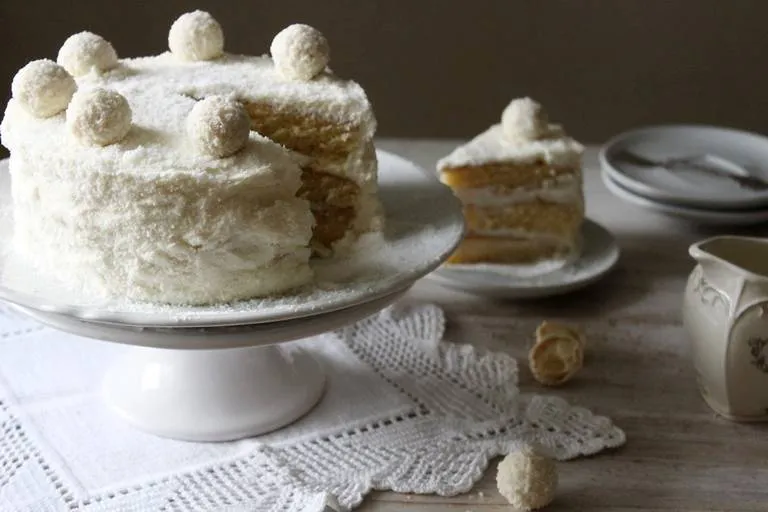 Нежна и ароматна торта, впечатлява с елегантната си визия. Има различни варианти за изпълнение, но декорацията от бонбони "Рафаело" е задължителна. Аз я направих с маслени блатове, с лешниково брашно и Маскарпоне крем