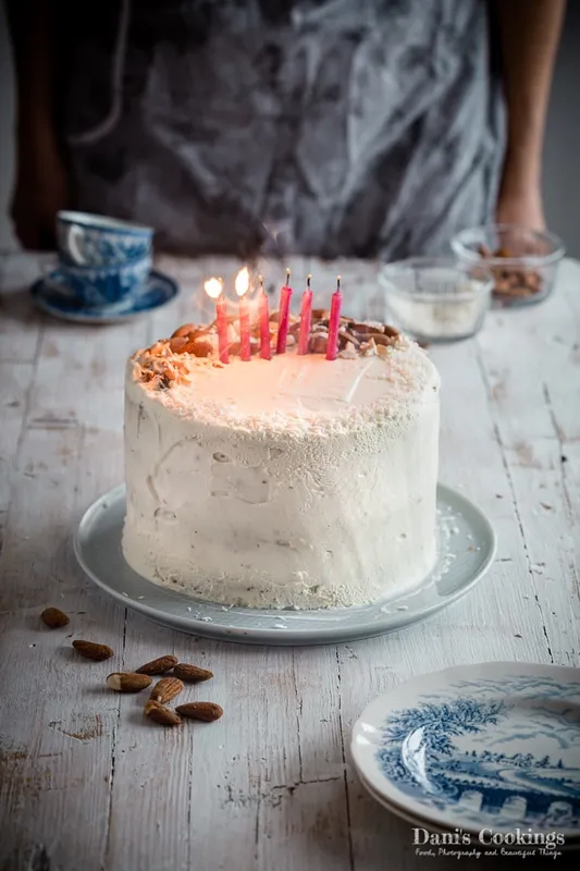 Ефектна торта с бадемови блатове и кокосов крем, вдъхновена от бонбоните Рафаело.