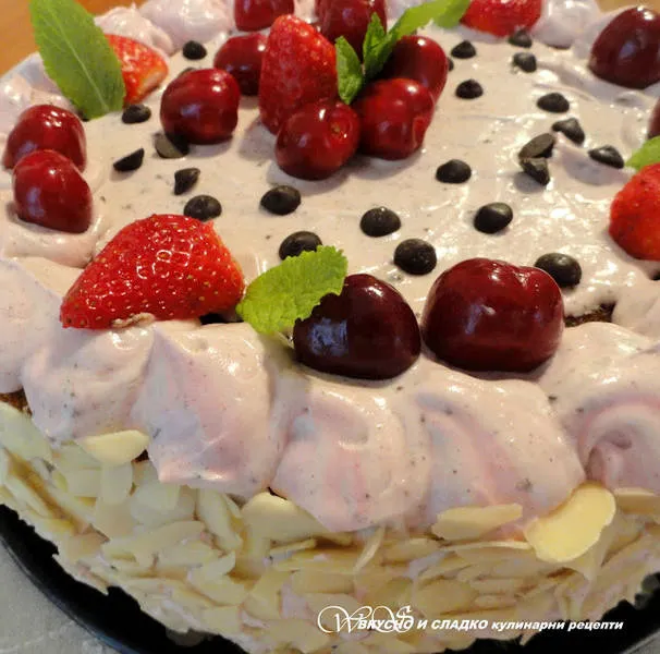 Торта с череши, маскарпоне, бял шоколад и крем Страчатела