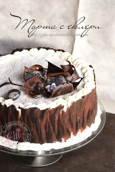 Вкусна домашна торта с еклери, варен крем и шоколадова украса