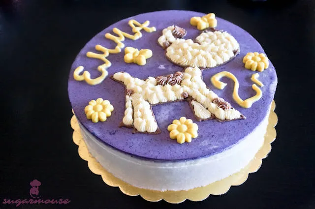 Йогурт крем с кокосова сметана, боровинков баварски крем, парченца поширана круша, пандишпанови блатове Генуа със сушени боровинки. Прекрасния лилав цвят се дължи само на боровинките.