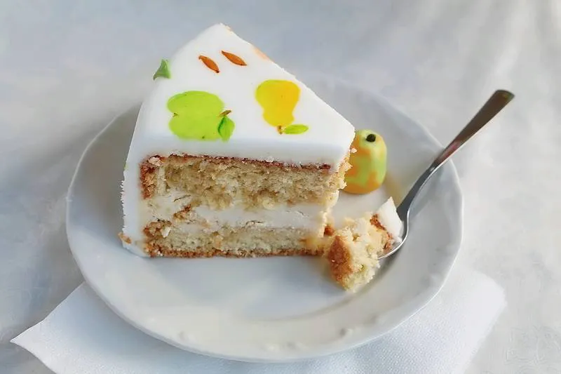 Вкусна пандишпанова торта с маскарпоне крем, украсена с плодове от фондан. В публикацията ще намерите видео как се прави украсата