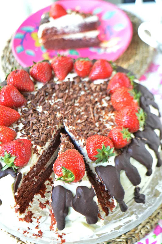 Неустоимо вкусна торта със сочни блатове с кафе и какао, сметана, пресни ягоди и шоколадов ганаш