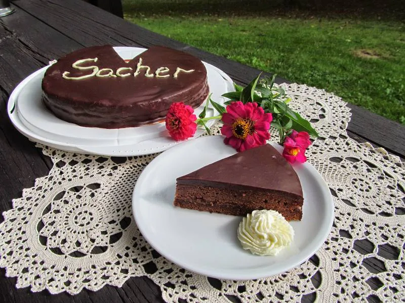 Невероятно съчетание на два шоколадови блата, слепени по между си с обилно количество сладко от кайсии. Тортата е залята с шоколадова глазура и има задължителния надпис Сахер - името на човека създал този сладкиш.