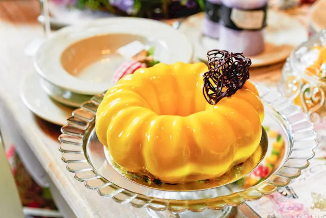 Шоколадово кремьо с парченца сушени калифорнийски сини сливи, лимонов мус, шоколадов блат без брашно, огледална глазура.