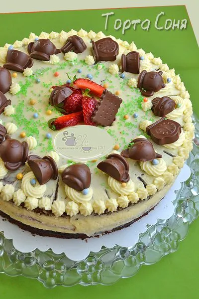 Торта със сочни шоколадови блатове, шоколадов крем с маскарпоне и плодово желе