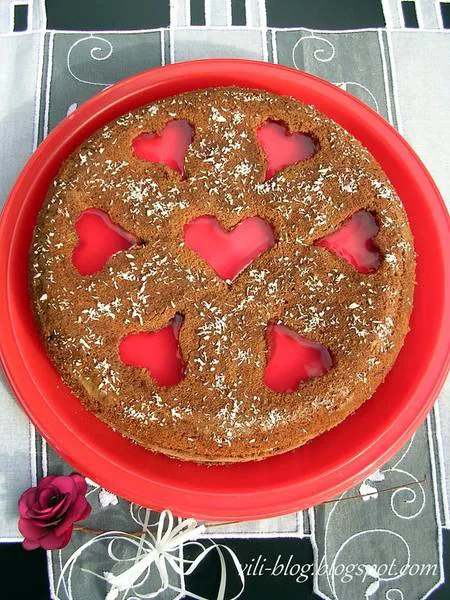 - Глазурата се приготвя според упътването и с нея се запълват отворите-сърца. По желание може да се поръси с кокос и отгоре.