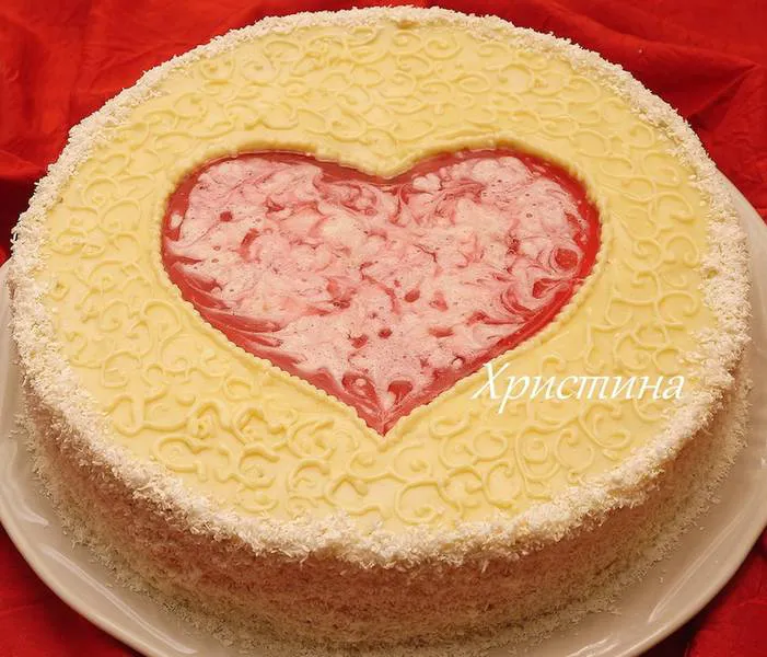 - Отваряем ринг се поставя в поднос. Поставя се един блат, върху него се разстила крем, следва блат, пак крем и най-отгоре се поставя блата с отрязаното сърце. Намазва се с крем, като от крема трябва да остане малко за замазване на борда на тортата.