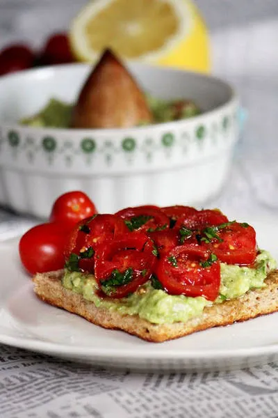 Всяка филийка намажете с гуакамоле и подредете домати отгоре.Полейте с дресинг от салатата или със струйка зехтин.