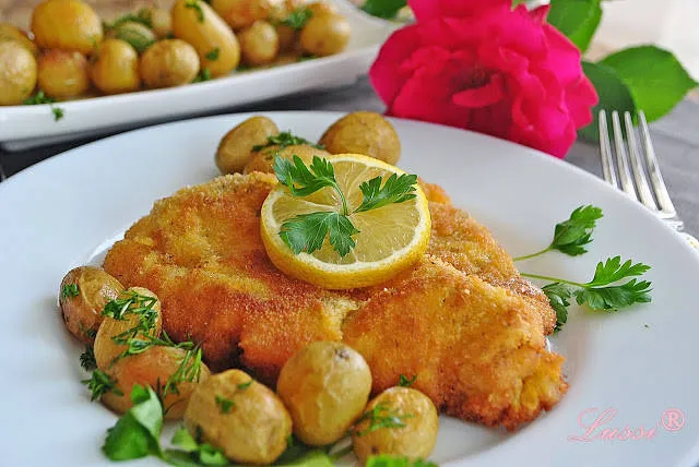 Хрупкав и ароматен немски шницел, по правило се сервира с резен лимон и малко пресен магданоз и картофи за гарнитура